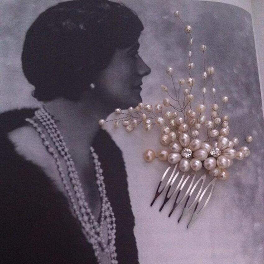 Pente confeccionado com pérolas e mini pérolas de água doce, formando delicados raminhos e flores,