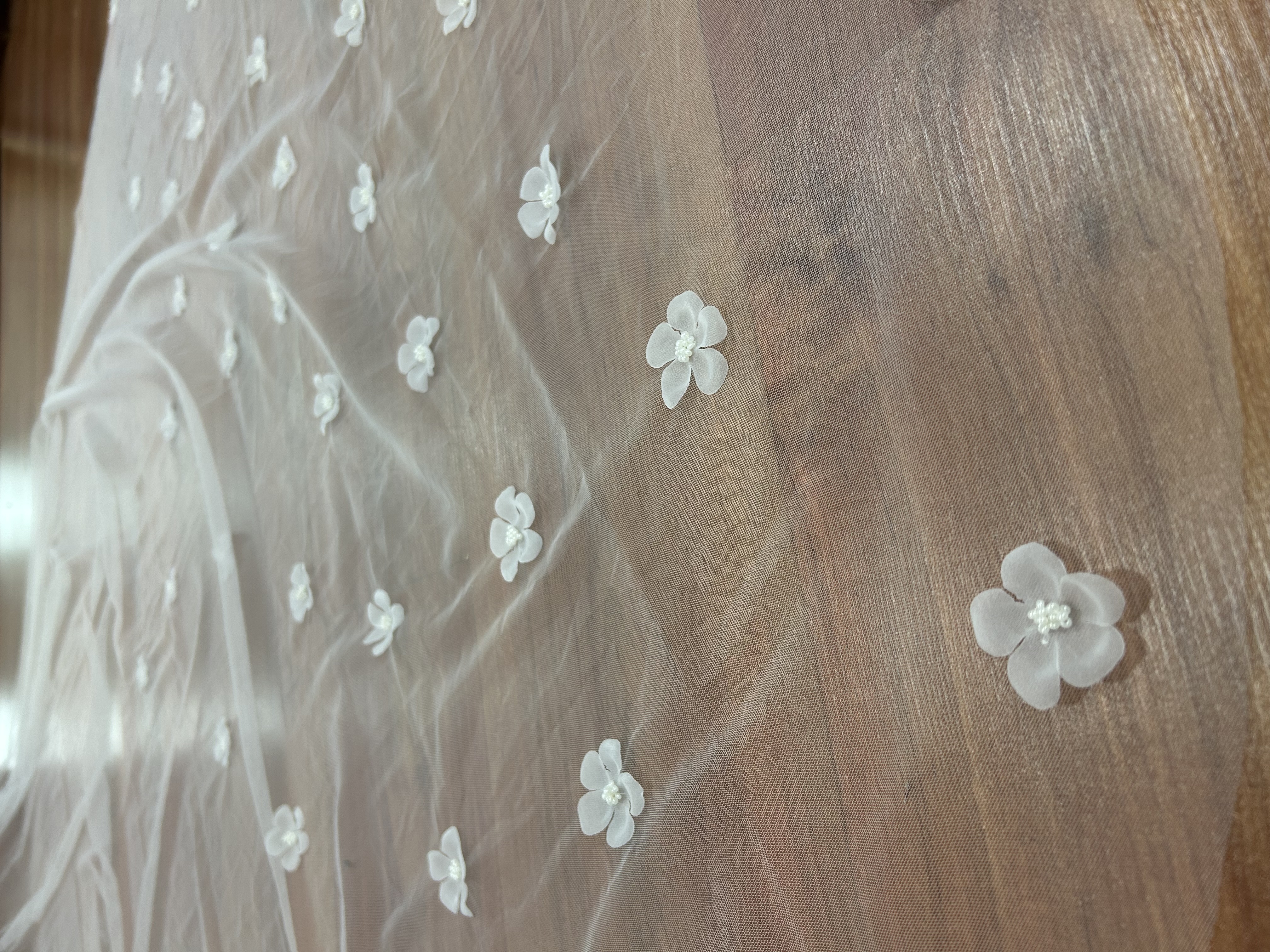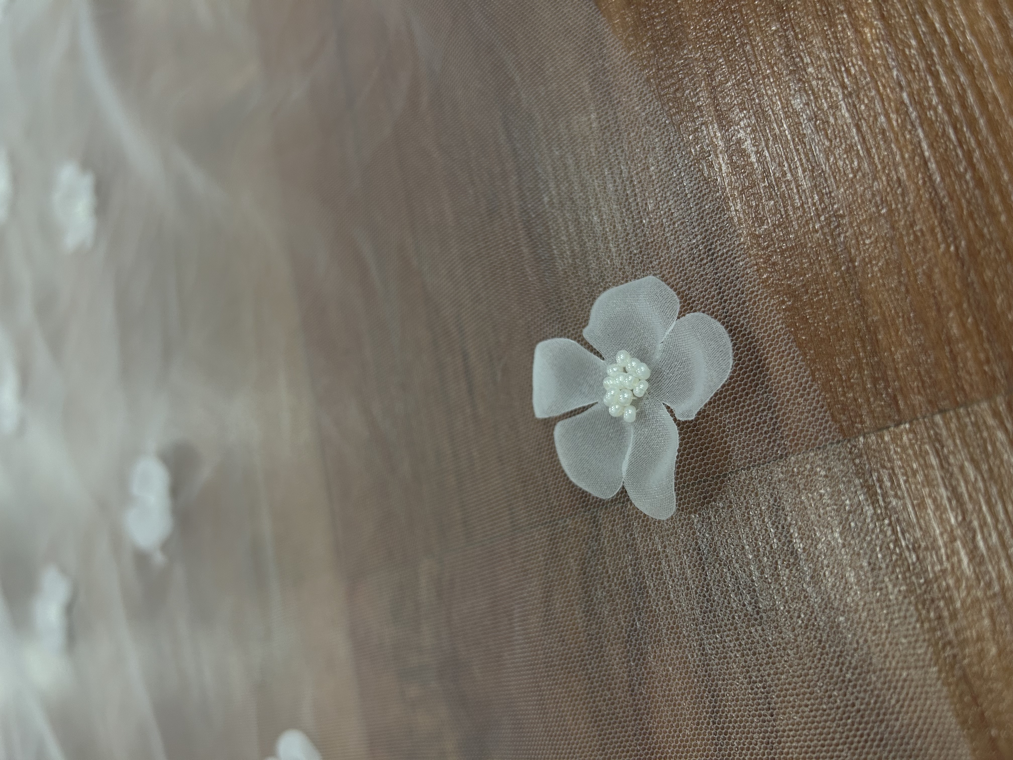 Véu tule italiano com aplicação de flores modeladas artesanalmente em organza, as flores possuem bordados delicados em seu centro com vidrilho perolado. Costurado a mão com linha invisível.